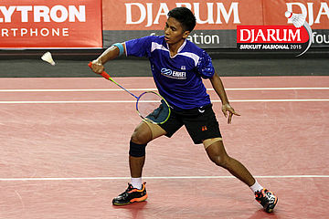 Bagas Kristianto (Djarum Kudus) mengembalikan shuttlecock ke arah Gatjra Pilliang (Exist)