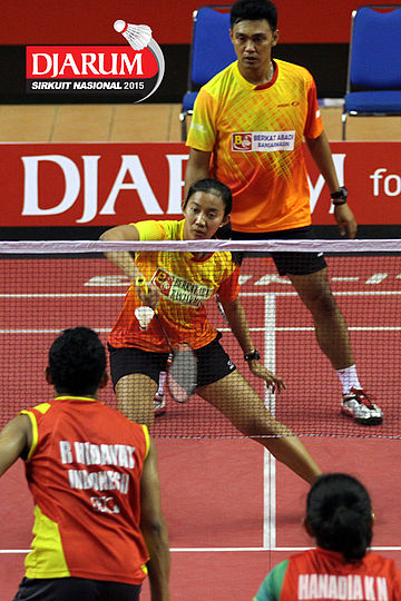 Ardiansyah Putra/Devi Tika Permatasari (Berkat Abadi) mengembalikan shuttlecock ke arah Rizky Hidayat/Keshya Nurvita Hanadia (Hi Qua Wima/Berkat Abadi)