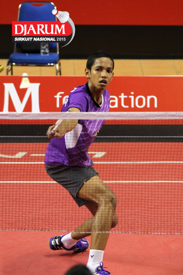 Panji Akbar(Pelatprov PBSI DKI Jakarta) menghadang serangan yang dilepaskan Alamsyah Yunus (JR Enkei)