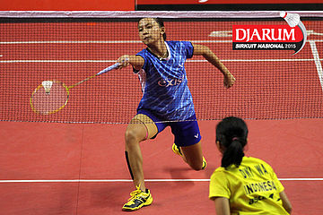 Putri Ayu (Exist) mengembalikan shuttlecock ke arah Asty Dwi (Jaya Raya)