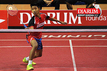 M. Lutfi Erlangga (Mutiara Cardinal) mengembalikan shuttlecock ke arah Chico Aura (Exsit)