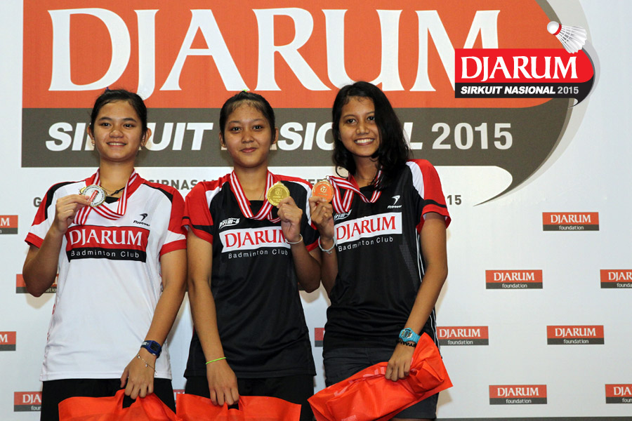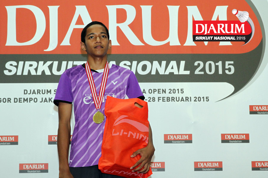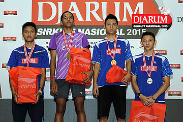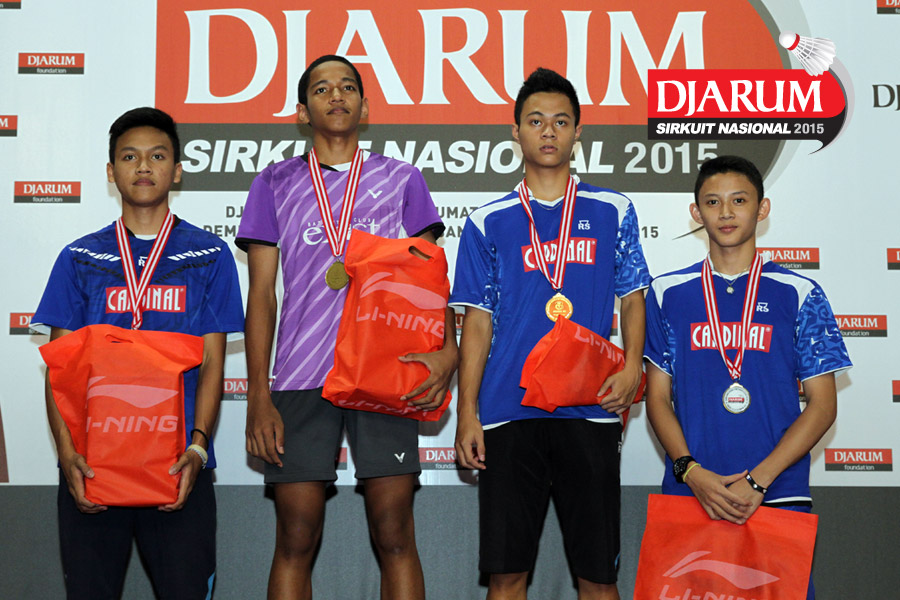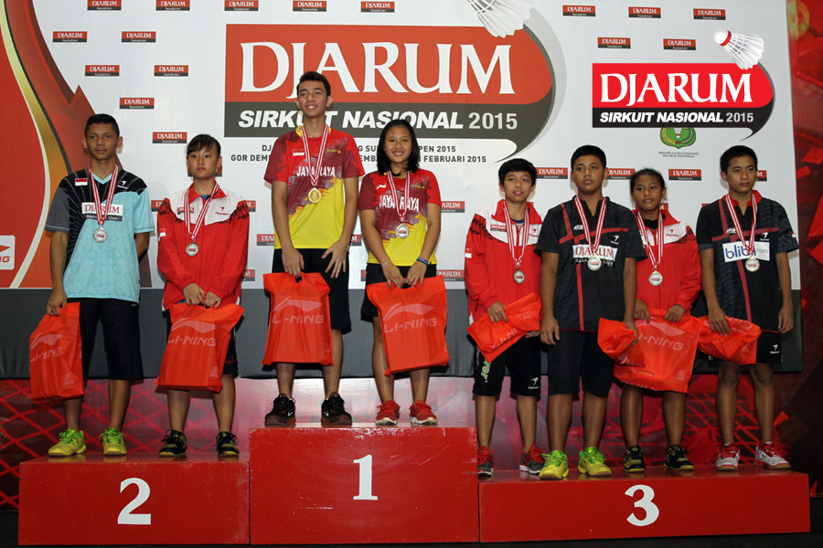 Alfandy Rizky/P. H. Mentari (Jaya Raya) mengembalikan shuttlecock ke arah Feisal Wiranto/Agatha Imanuela (Djarum Kudus)