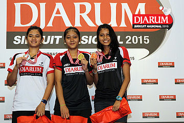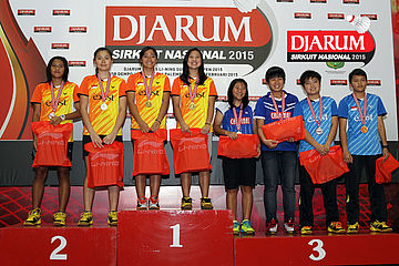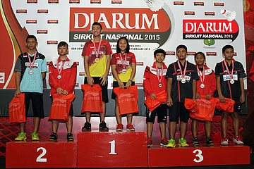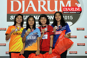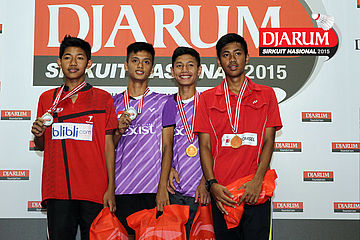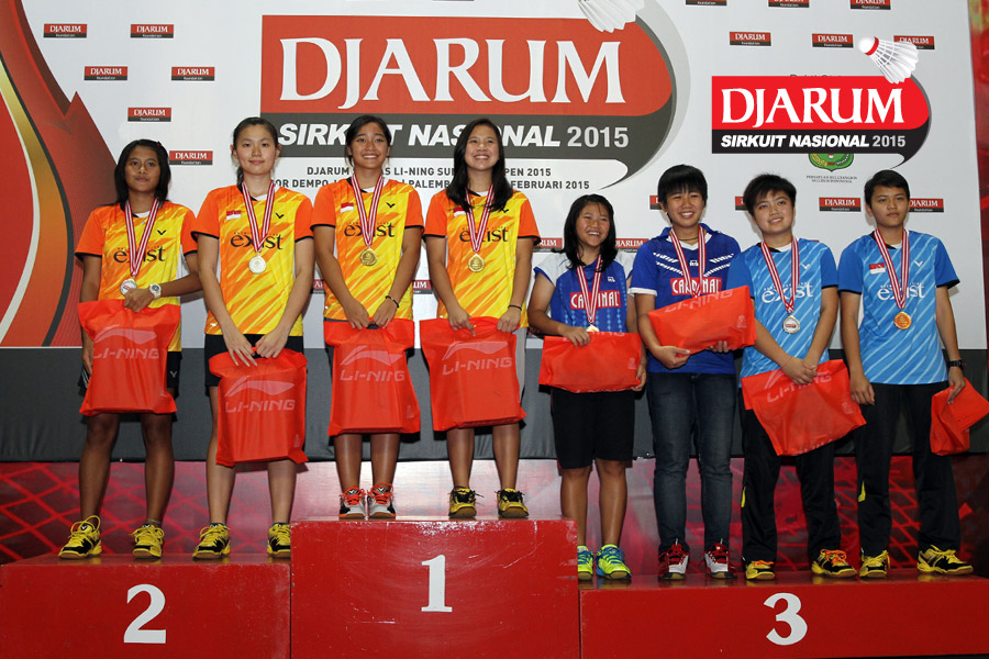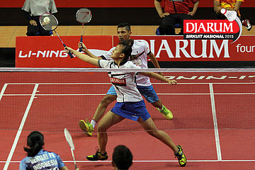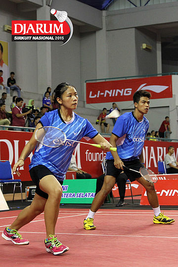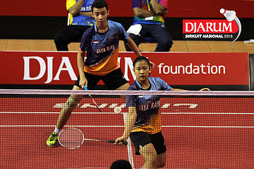 Jeka Wiratama/Vita Marissa (Djarum Kudus) menghadang serangan yang dilepaskan Ardiansyah Putra/Devi Tika Permatasari (Berkat Abadi)