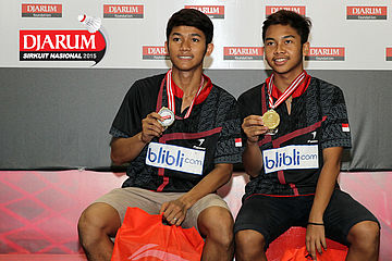 Feisal Wiranto/Agatha Imanuela (Djarum Kudus) menghadang pengembalian dari Alfandy Rizky/P. H. Mentari (Jaya Raya)