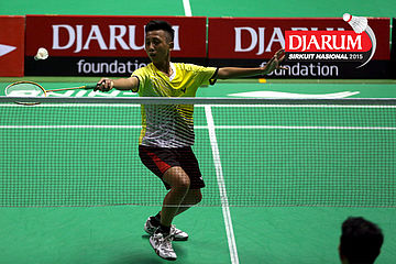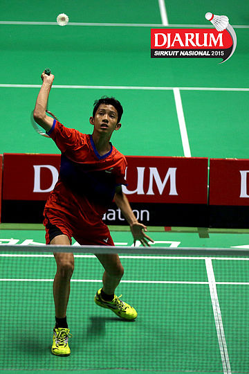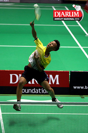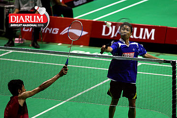 Felix Mulya (Exist) menyambut pengembalian shuttlecock.