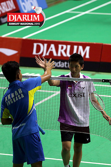 Felix Mulya (Exist) bersalaman dengan Akbar (Angkasa) usai bertanding.