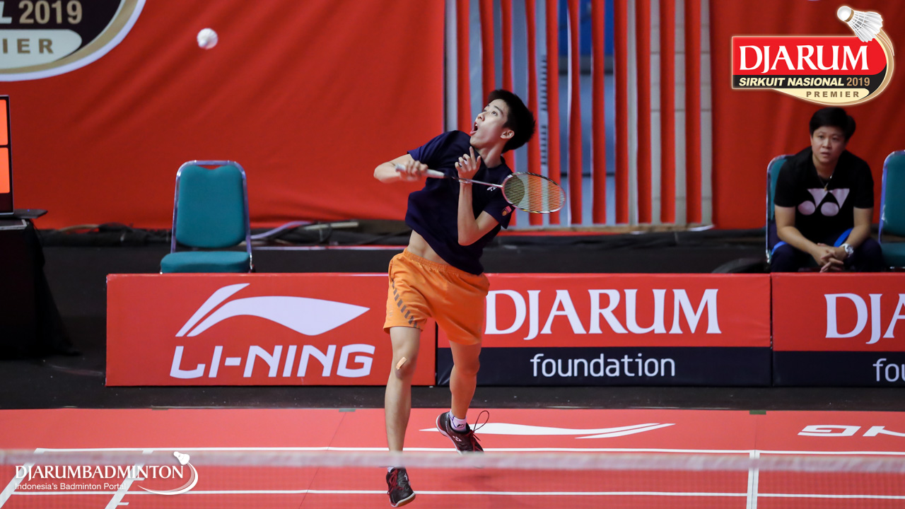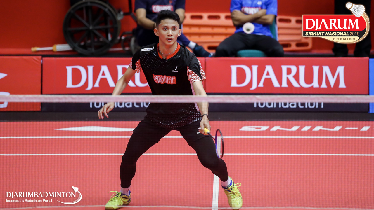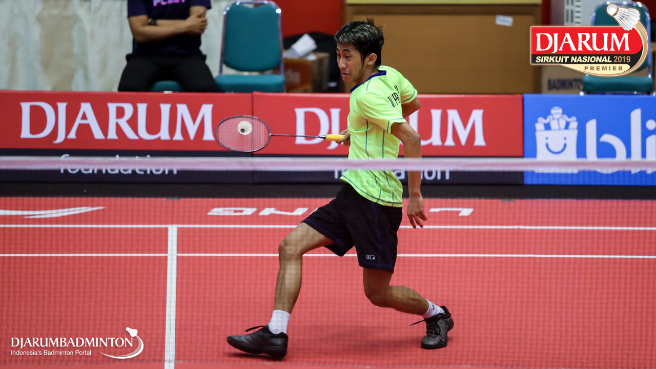 Wisnu Yuli Prasetyo (Pertamina Fastron, Jakut) bersiap menyambut shuttlecock