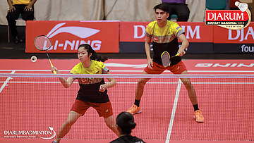 Swiking Imanuel Wuisan+Nathalie Ivyana (Daihatsu Candra Wijaya) bersiap menyambut shuttlecock