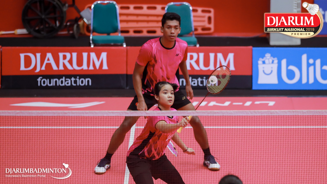 Alif Rafsyah Mauthuthihona+Monika Insany (Mutiara Cardinal, Bandung) bersiap mengembalikan shuttlecock