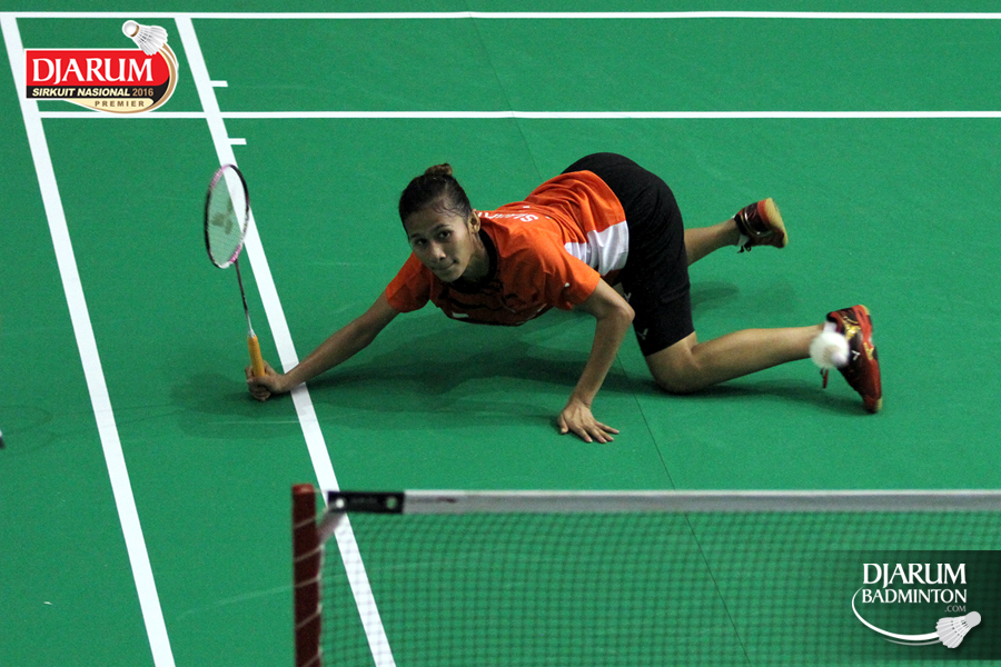 Hera Desiana (Mutiara Cardinal) mengembalikan shuttlecock