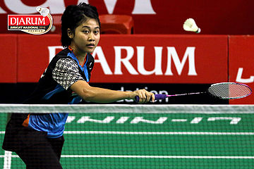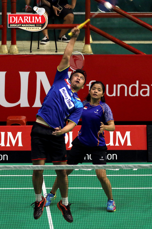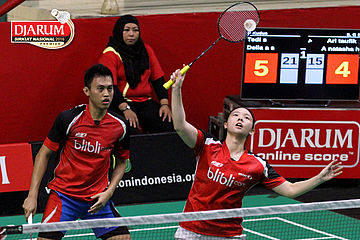 Tedi Supriadi/Della Augustia (Djarum Kudus) Menghadang Serangan.