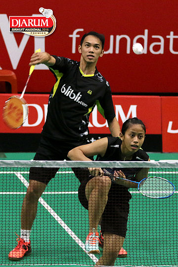 Fernando Kurniawan/Dian Fitriani (Djarum Kudus/Pertamina Fastron) Mengembalikan Shuttlecock.