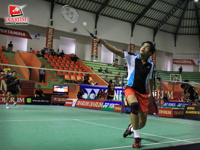Pemain SGS PLN Bandung, Senatria berusaha mengembalikan kok ke arah pemain PB Jaya Raya Surya Naga, Tan Tony dalam babak perempat final tunggal dewasa putra Djarum Sirkuit Nasional Bali di GOR Purna Krida, Badung, Jumat (14/10).