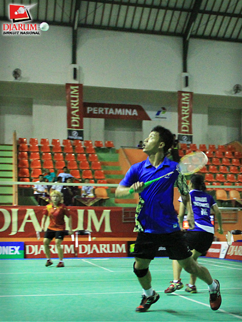 Pasangan ganda campuran Pusdiklat Jaya Raya, Subhan Hasan/Rizky Amelia Pradipta berusaha mengembalikan kok ke arah pasangan Trikus Harjanto/Kesya Nurvita dalam perempat final ganda dewasa campuran Djarum Sirkuit Nasional Bali di GOR Purna Krida, Badun