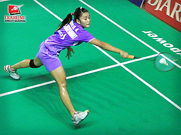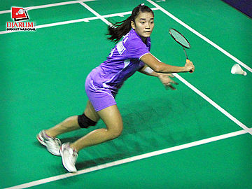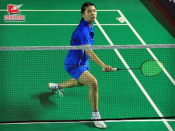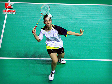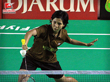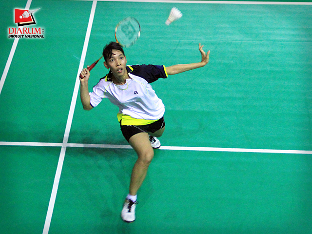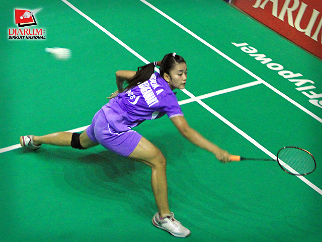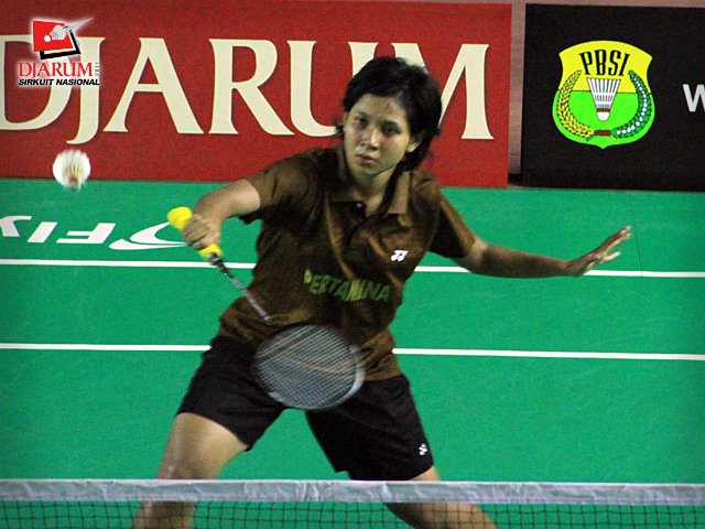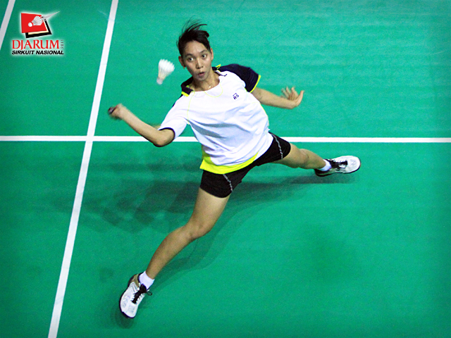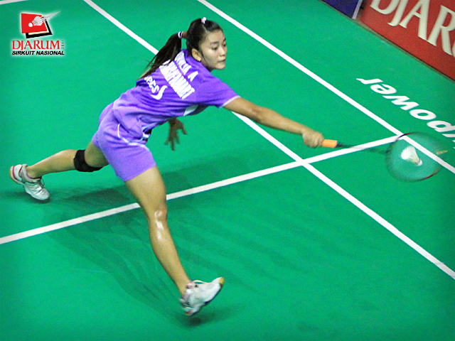 Pemain PB Pertamina Indonesia, Ganis Nur R berusaha mengembalikan kok ke arah pemain PB Surya Baja Surabaya, Silvinna Kurniawan dalam babak perempatfinal tunggal dewasa putri Djarum Sirkuit Nasional Makassar di GOR Sungguminasa, Gowa, Kamis(20/10)