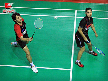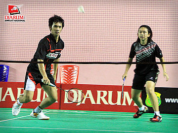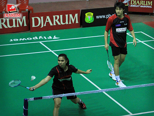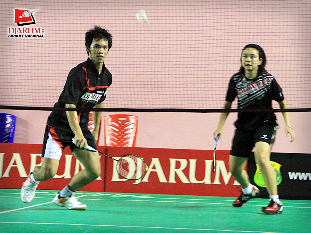 Pemain PB Djarum/PB Mutiara, Rizky Yanu/Ayu Rahmasari berusaha mengembalikan kok ke arah pemain PB Tsunami/PB Keshab, Yusuf Ahmad/Lidyawati L dalam babak semifinal ganda dewasa campuran Djarum Sirkuit Nasional Makassar,Gowa, Jumat(21/10)