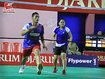Pemain PB Djarum/SGS Elektrik PLN, Fernando K/Kesya Nurvita berusaha mengembalikan kok ke arah pemain PB Ganesha Islamic Village/ SGS Elektrik PLN, Ardiansyah/Devi Tika dalam babak semifinal ganda dewasa campuran Djarum Sirkuit Nasional Makassar, Gowa