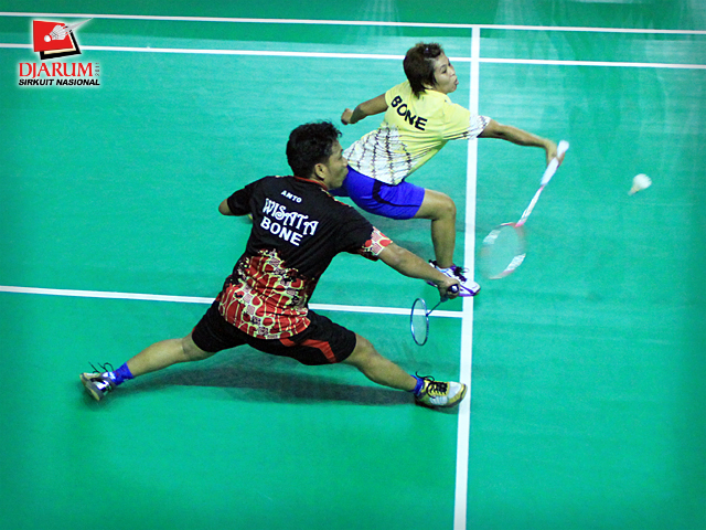 Pemain PBSI Bone, Henri/Sahida berusaha mengembalikkan kok ke arah pemain PB Djarum, Rendra Wijaya/Maria Elfira dalam babak semifinal ganda dewasa campuran Djarum Sirkuit Nasional Makassar,Gowa, Jumat(21/10)