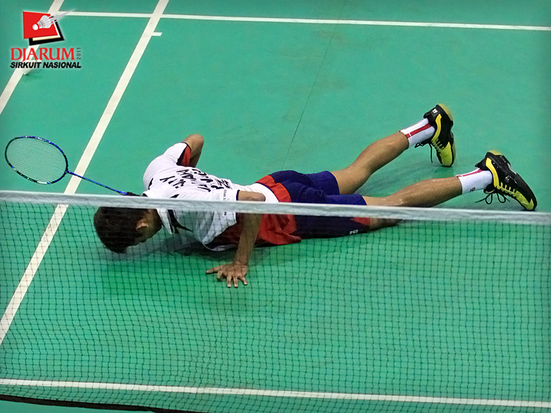 Pemain Jaya Raya Suryanaga, Fauzi Adnan terjatuh ketika berusaha mengembalikan kok ke arah pemain PB Djarum, Bandar Sigit Pamungkas dalam laga final tunggal putra Djarum Sirkuit Nasional Pangkalpinang, Sabtu (24/9) di GOR Kacang Pedang, Pangkalpinang.