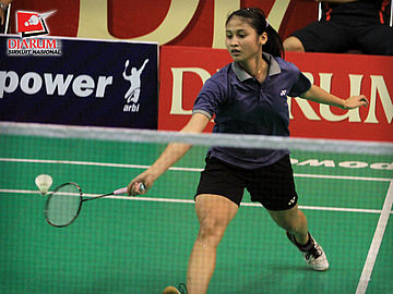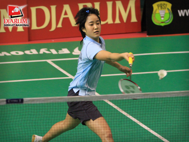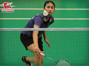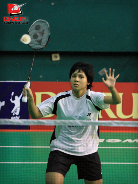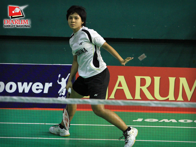 Pemain Pelatnas, Putri Muthia Restu P berusaha mengembalikan kok ke arah pemain Pusdiklat Jaya Raya, Rizky Amelia dalam babak perdelapan final tunggal dewasa putri Djarum Sirkuit Nasional Surabaya di GOR Sudirman, Surabaya, Rabu (2/11).