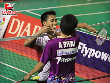 Pemain Pertamina, Alamsyah dan pemain Bank Sumsel-BABEL, Achmad Rivai berpelukan setelah tanding dalam babak Semifinal dewasa putra Djarum Sirkuit Nasional Surabaya di GOR Sudirman, Surabaya, Jum`at (4/11).