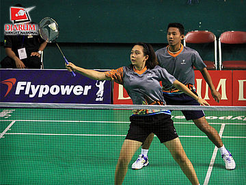 Pemain SGS PLN BDG, Andhika Anhar/Keshya Nurvita Hanadia berusaha mengembalikan kok ke arah pemain Putra Eka/Haris Budiarti dalam babak perempat final Ganda Campuran Dewasa Djarum Sirkuit Nasional Surabaya di GOR Sudirman, Surabaya, Jum`at (4/11).