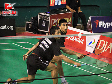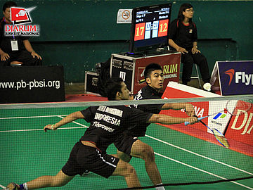 Pemain PB Djarum, Jeka Wiratma/Rafiddias Akhdan N mengembalikan kok ke arah pemain Pusdiklat Jaya Raya, R Eka Fajar Kusuma/Rian Swastedian dalam babak Perempat Taruna Putra Djarum Sirkuit Nasional Surabaya di GOR Sudirman, SBY, Jum`at (4/11).
