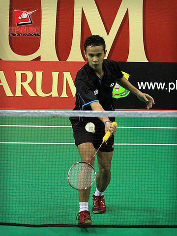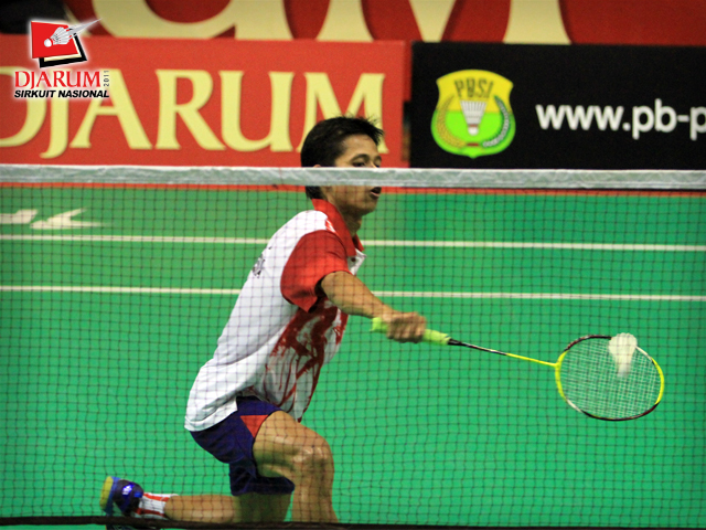 Pemain Jaya Raya Suryanaga, Fauzi Adnan mengembalikan kok ke arah pemain SGS PLN Bandung, Senatria Agus Setia Putra dalam babak Semifinal dewasa putra Djarum Sirkuit Nasional Surabaya di GOR Sudirman, SBY, Jum`at (4/11).