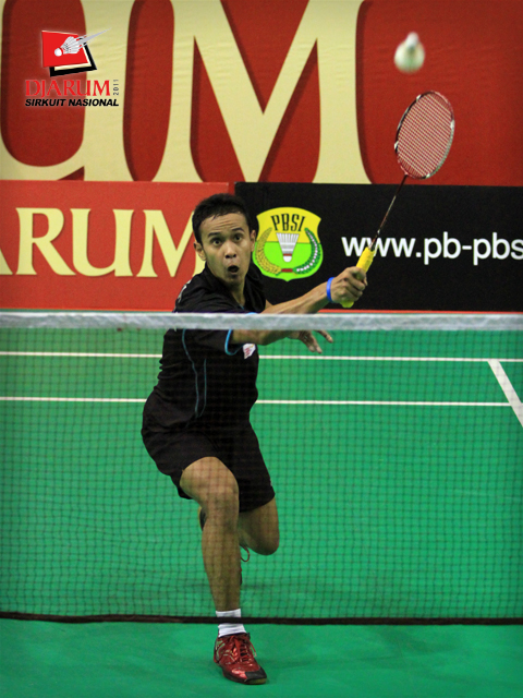 Pemain Bank Sumsel BABEL, Achmad Rivai mengembalikan kok ke arah pemain Pertamina, Alamsyah Yunus dalam babak Semifinal dewasa putra Djarum Sirkuit Nasional Surabaya di GOR Sudirman, SBY, Jum`at (4/11).