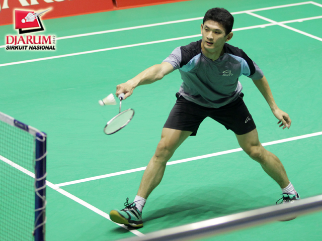 Tan Yony (Jaya Raya Sutyanaga) menyambut serve dari Alamsyah Yunus (Pertamina Indonesia).