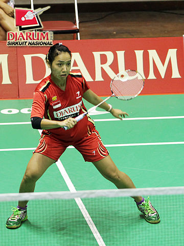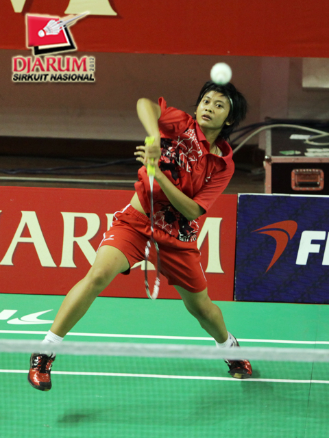 Intan Dwi Jayanti (PB Djarum Kudus) berusaha mengembalikan bola ke arah Berliyan Sudrajat (Semen Gresik).
