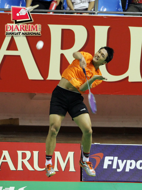 Jonatan Christie (Tangkas Specs) melepaskan smash keras ke arah Ihsan Maulana (PB Djarum Kudus).