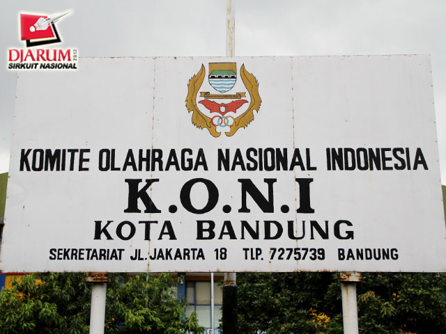 Papan nama yang terdapat di depan GOR Koni yang berada di Jl. Jakarta, Bandung.