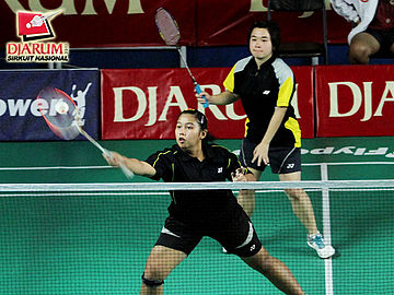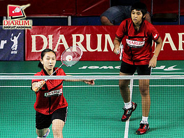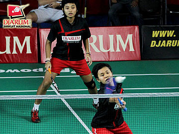 Rintan A yang berpasangan dengan Natalia Poluakan dari klub Tangkas Specs sedang memukul kok untuk dikembalikan kepada lawannya yang berasal dari Jepang, Miyoshe Nao / Moue Emi (Hokuto Bank Japan).