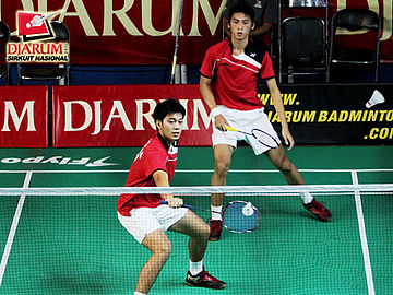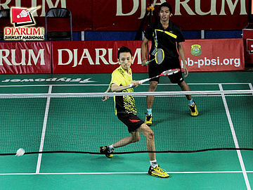 Selvanus Geh yang berpasangan dengan Ronald Alexander (Pelatnas) sedang memukul kok untuk dikembalikan kepada pasangan Darmiko (Djarum Kudus) / Samuel Paulus (Tangkas Specs).