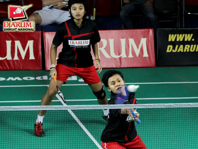 Dina KhoirunniSa yang berpasangan dengan Sheren Regina Natsir (Pelatprov PBSI DKI Jakarta) sedang memukul kok untuk dikembalikan kepada pasangan Dara Ayu Setiawan/ Tresna Novelia Citra Resmi (Djarum Kudus).