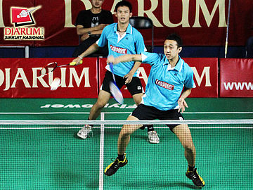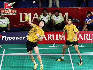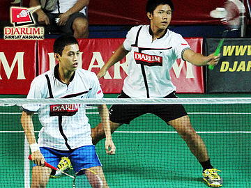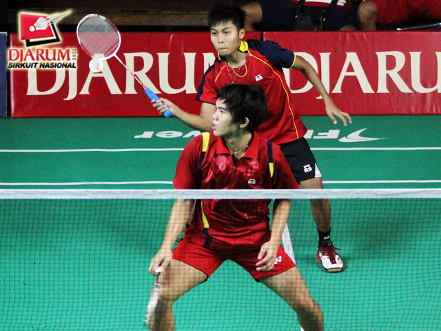 Pasangan ganda taruna putra Tedi Supriadi / Yantoni Edy Saputra (Djarum Kudus) yang sedang bertanding melawan Didi Cardy dan Roni Andreas dari PT. Satu.