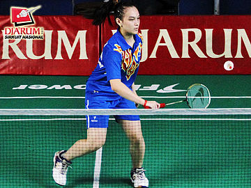 Rena Asela (Djarum Kudus) sedang mengembalikan kok kepada Fina Nuraena dari SGS PLN.