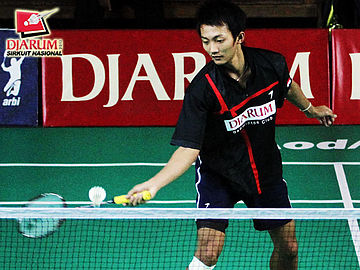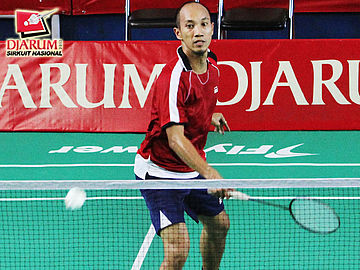 Priayi Reza Anang yang berpasangan dengan Dian Hadi Syaputra (Jaya Raya Suryanaga) sedang memukul kok untuk dikembalikan kepada pasangan Arsya Isnanu Ardi Putra/ Hantoro (Djarum Kudus).