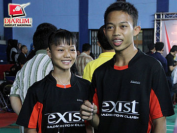 Pemenang ganda campuran remaja dari Exist Jakarta, Fitriani dan Rohmat Ar sedang diwawancara mengenai jalannya pertandingan final yang diadakan di GOR Koni Bandung pada tanggal 26 Mei 2012.