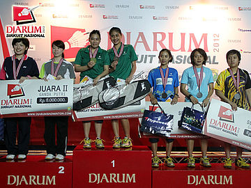 Para pemenang ganda dewasa putri berfoto bersama di podium.