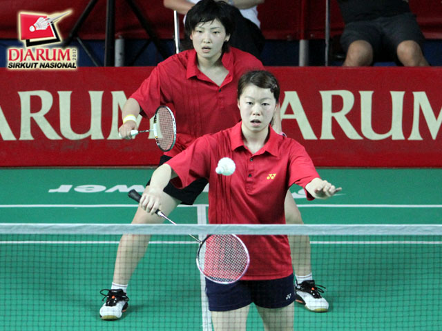 Pasangan ganda taruna putri dari Hokuto Bank Japan, Anai Yuki yang berpasangan dengan Murayama Yumi sedang melakukan serve untuk diberikan kepada pasangan Pia Zebadiah / Rizky Amelia (Pusdiklat Jaya Raya).