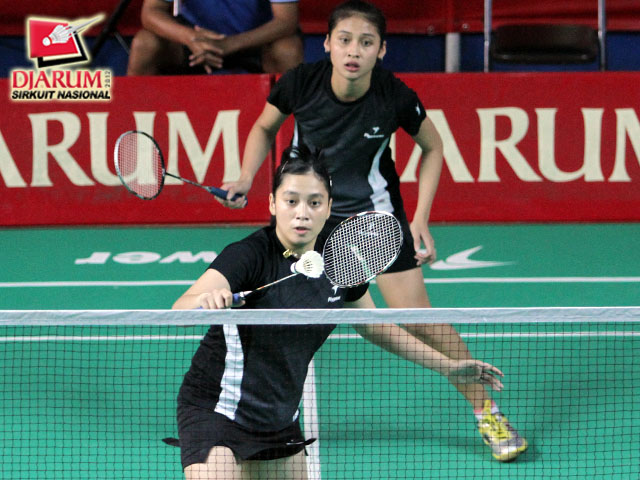 Pia Zebadiah yang berpasangan dengan Rizky Amelia (Pusdiklat Jaya Raya) sedang mengembalikan kok kepada pasangan Anai Yuki / Murayama Yumi dari Hokuto Bank Japan.