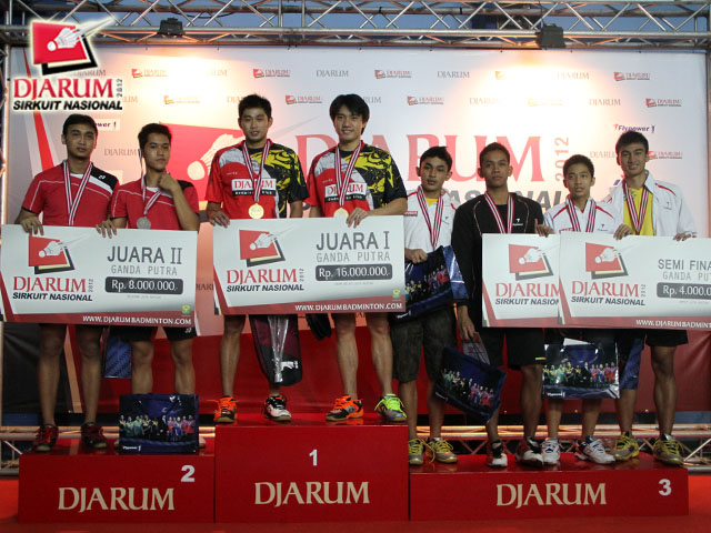 Para pemenang ganda dewasa putra berfoto bersama di podium.