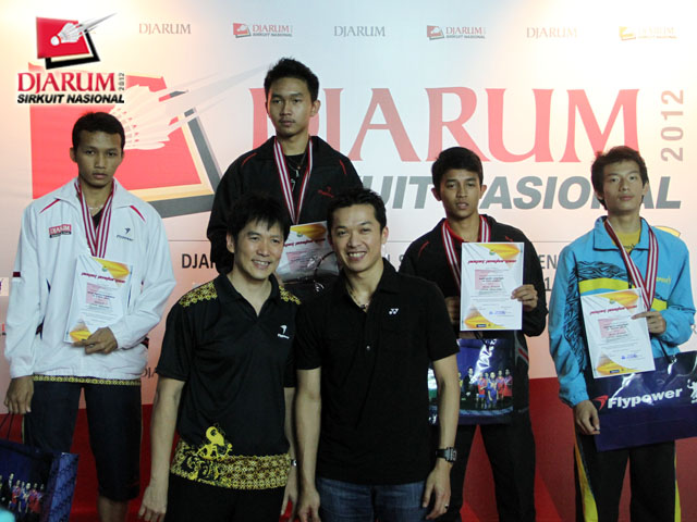 Para pemenang tunggal dewasa putra berfoto bersama di podium.