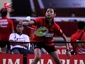 Pemain Jaya Raya Suryanaga, Meirisa berusaha mengambalikan kok ke arah pemain PB Exist, Priskila S.