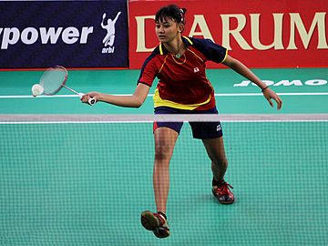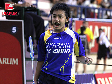 Pemain PB Djarum, Anes Penty Naris berusaha mengembalikan kok ke arah pemain Fisita.