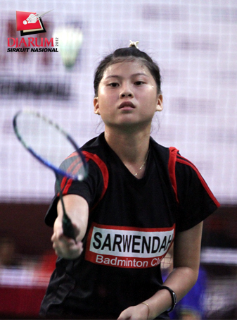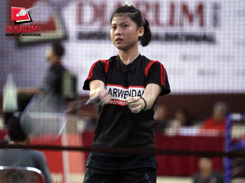 Pemain PB Djarum, Rifa Putri Aida, berusaha mengembalikan kok ke arah pemain Pusdiklat T, Nur Ayu.