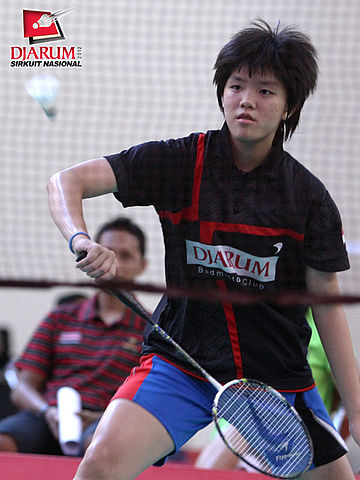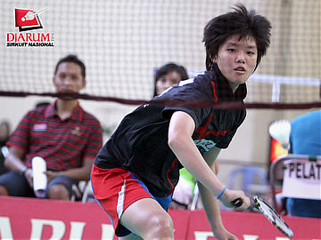 Pemain tunggal pemula putri asal PB Djarum, Serena Kani berusaha mengembalikan kok ke arah pemain PB Exist, Annisa.