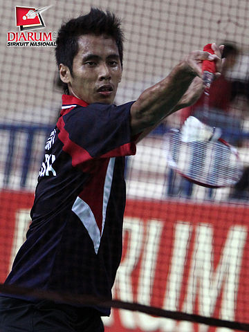 Pemain tunggal dewasa putra asal Jaya Raya Suryanaga, Fauzi Adnan berusaha mengembalikan kok ke arah pemain Bank Kaltim, Edy S.